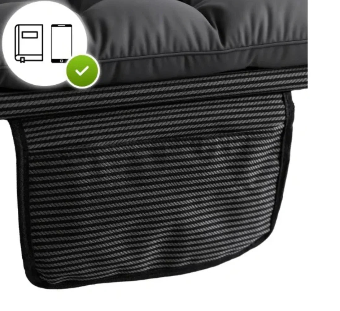 Sì, include una tasca laterale per piccoli oggetti (telefono, libro, occhiali) e poggiatesta integrato. Non richiede montaggio: pronto all’uso immediato.